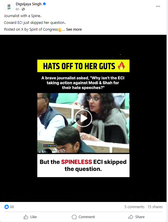 Congress leader Digvijaya Singh was among multiple social media users who shared the 39-second-long-clip, with an in-video text saying, “A brave journalist asked, “Why isn’t the ECI taking action against Modi & Shah for their hate speeches?” But the spineless ECI skipped the question.”