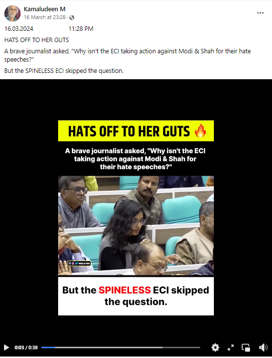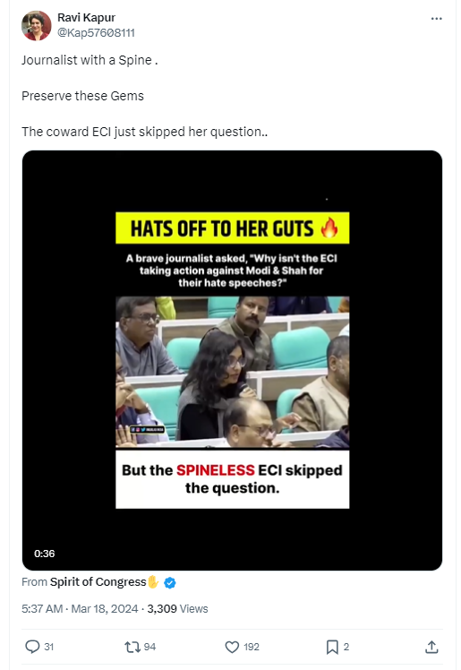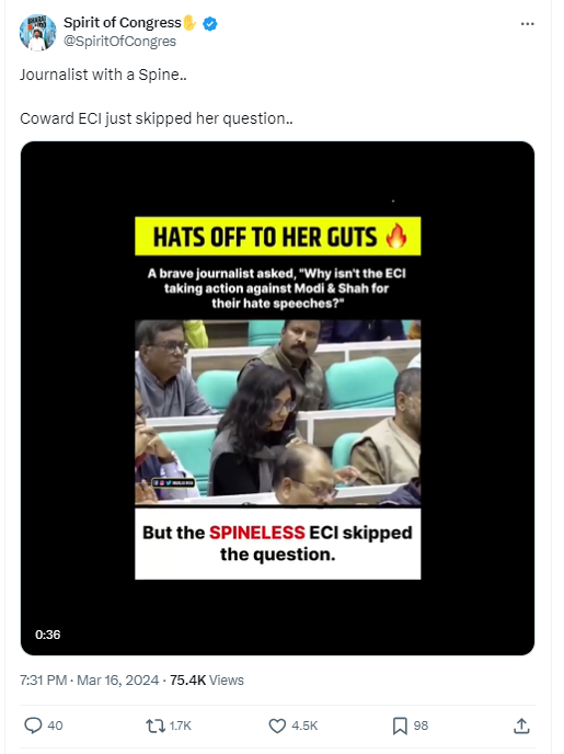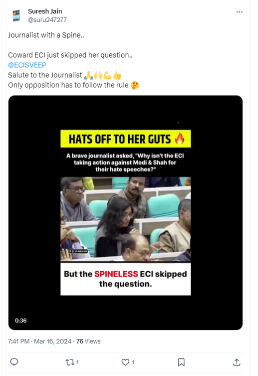 In the footage, the journalist can be heard saying “You had said in your speech that… there should be no hate speech… there will be a calibrated approach to code violations. But there have been several complaints against the Prime Minister and Amit Shah… ECI has not taken action against them. You have taken action against the opposition leaders. So even if you take a calibrated approach, so won’t it be the opposition leaders who get picked up more? Who will get notice from you more than the ruling party leaders? (sic)”