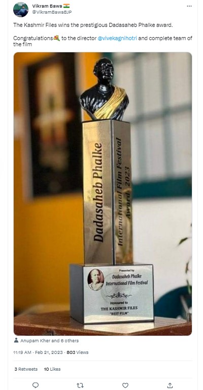 Nearly a year since its release, the buzz around ‘The Kashmir Files’ refuses to die down on social media platforms. The movie became the talking point yet again after its director Vivek Agnihotri, who had earlier misleadingly claimed that his film had been “shortlisted” for Oscars, announced that movie won “ the ‘Best Film’ award at #DadaSahebPhalkeAwards2023.”