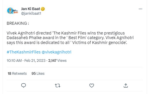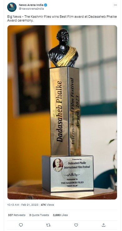 In a tweet dated February 21, 2023, Agnihotri stated, “ANNOUNCEMENT: #TheKashmirFiles wins the ‘Best Film’ award at #DadaSahebPhalkeAwards2023. This award is dedicated to all the victims of terrorism and to all the people of India for your blessings.”