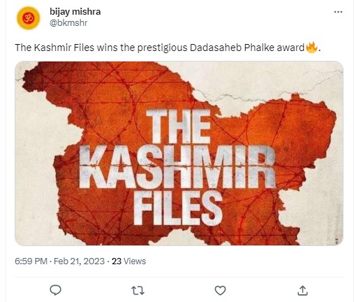 Soon after Agnihotri’s claim, several Twitter users also reshared the pictures posted by Agnihotri and congratulated him as “The Kashmir Files won Best Film at Dadasaheb Phalke Awards 2023.”