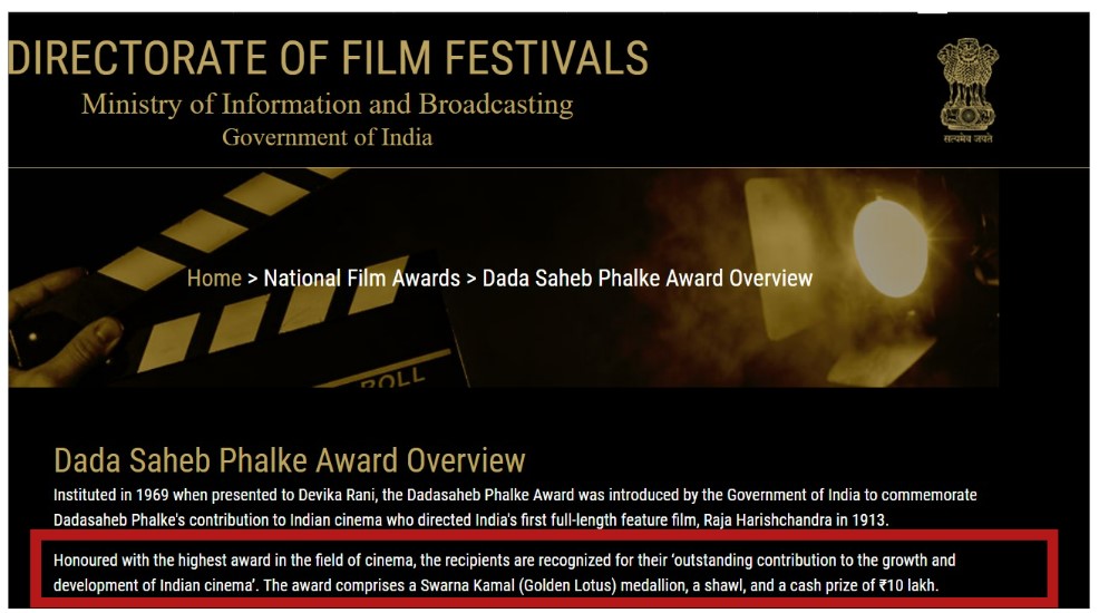 A keyword search for “Dadasaheb Phalke Award” on Google led us to the official website of the Directorate of Film Festivals under the I&B Ministry. Detailing about the Dadasaheb Phalke Awards, the website stated, “Instituted in 1969 when presented to Devika Rani, the Dadasaheb Phalke Award was introduced by the Government of India to commemorate Dadasaheb Phalke’s contribution to Indian cinema who directed India’s first full-length feature film, Raja Harishchandra in 1913.”
