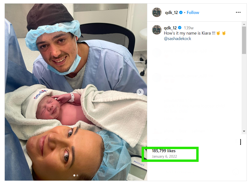 A Google lens search on Image 3 led us to an Instagram post by South African cricketer Quinton De Kock, dated January 6, 2022. It featured a photograph of the cricketer and his wife with their newborn in an identical frame as the viral image.