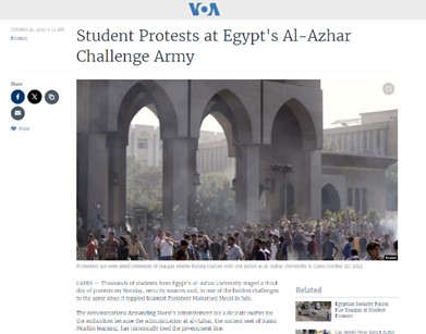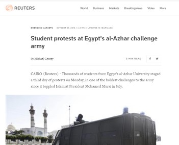 We then conducted a Google Key-word search with “Student Protests at Egypt’s Al-Azhar University”, during which we found many news report by VOA News, Reuters etc published on 20 & 21 October, 2013 respectively, revealing similar details.