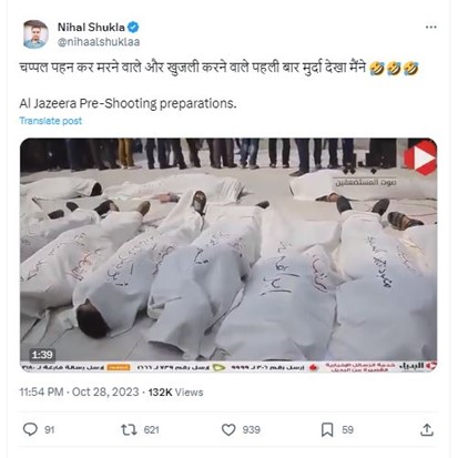 Amidst the large-scale armed retaliation by Israel on Gaza following the terrorist attack by Hamas early on October, a 1.47 min video is circulating on social media purportedly depicting dead bodies covered in white cloth. Users sharing the video allege that Palestinians in Gaza are staging deaths to gain international sympathy. The video seemingly shows moving bodies beneath the white sheets. The viral post can be seen here.