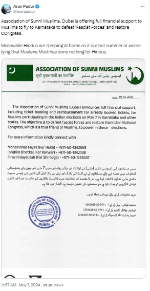Dubai-based “Association of Sunni Muslims” is offering financial support to Muslims to travel to Karnataka and other states so that they can vote for Congress in the Lok Sabha elections.