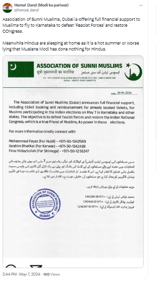 Several social media users are sharing a circular, purportedly issued by an “Association of Sunni Muslims”, based in Dubai, announcing “full financial support” in arranging for flights so that Muslims from Karnataka and other states can vote in the ongoing Lok Sabha elections to defeat “fascist forces” and bring the Congress back to power.