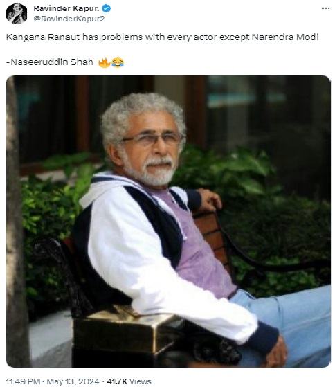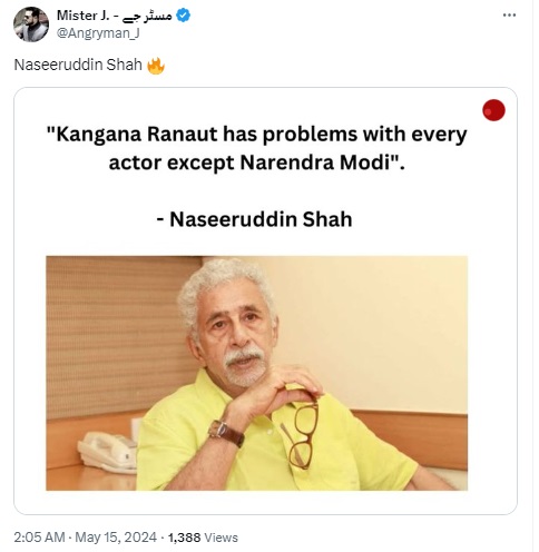 Kangana Ranaut has problems with every actor except Narendra Modi, says veteran actor Naseeruddin Shah.