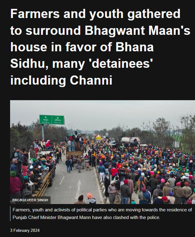 A report by BBC Punjabi, dated February 3, 2024, protesters heading towards Punjab CM Bhagwant Mann’s residence in Sangrur in support of social media personality Bhana Sindhu were stopped at several places. It also carried the visuals from the protest.