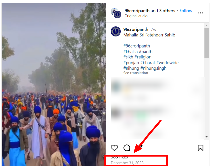 A Google lens search on the keyframes of the viral video yielded an Instagram post by @96croripanth, dated December 31, 2023. The post carried a shorter version of the viral footage, stating “Mahalla Sri Fatehgarr Sahib.”
