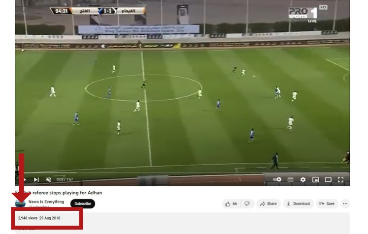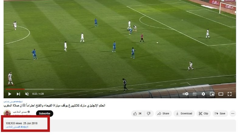 Additionally, we come across a longer version of the viral footage that was uploaded on YouTube on the verified channel @SadaAlMalaeb (صدى الملاعب) on January 25, 2018. The title of the video read, “English referee Mark Clattenburg stops the Al-Fayhaa and Al-Fateh match, out of respect for the Maghrib prayer call. “(translated from Arabic.)