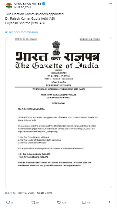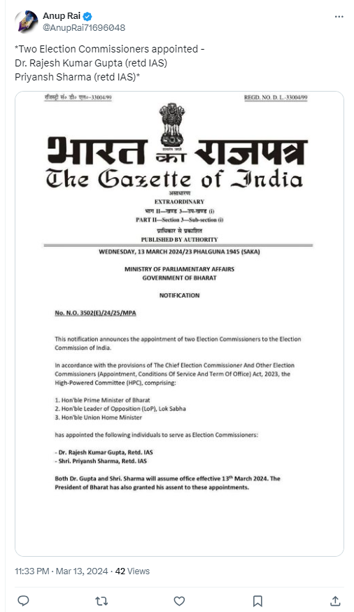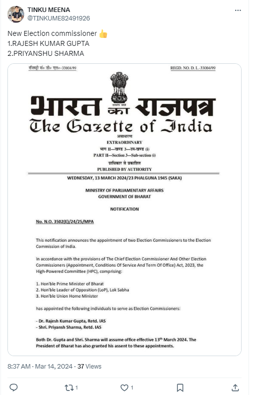 While the 2024 Lok Sabha election schedule is awaited, an alleged gazette notification by the Ministry of Parliamentary Affairs announcing the appointment of two retired IAS officers to the vacancy in the Election Commission has grabbed the social media attention. Multiple users shared a purported Gazette notification claiming that Rajesh Kumar Gupta and Priyansh Sharma have been appointed to “serve as election Commissioners.” The alleged gazette notification adds, “ Both Dr. Gupta and Shri. Sharma will assume office effective 13th March 2024. The President of Bharat has also granted his assent to these appointments.”