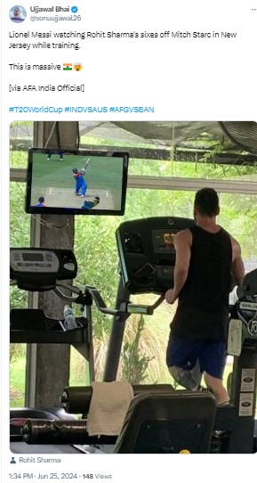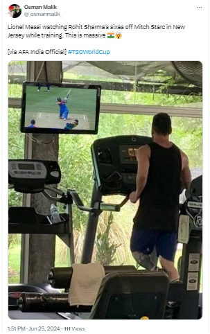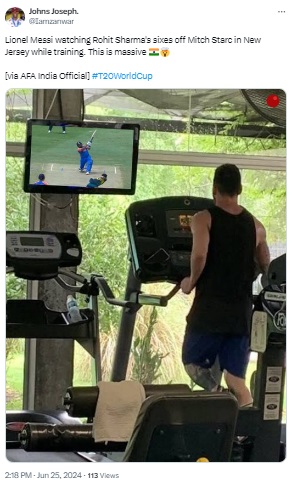 Argentina’s football captain Lionel Messi watches highlights of Rohit Sharma’s sixes against Australia’s Mitchell Starc on TV, while training in a gym.