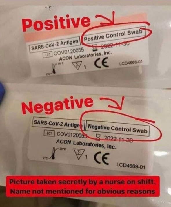 The image showing “Positive Control Swab” and “Negative Control Swab” on a COVID-19 antigen test kits by ACON laboratories are in fact used to maintain quality control, not for testing patients.