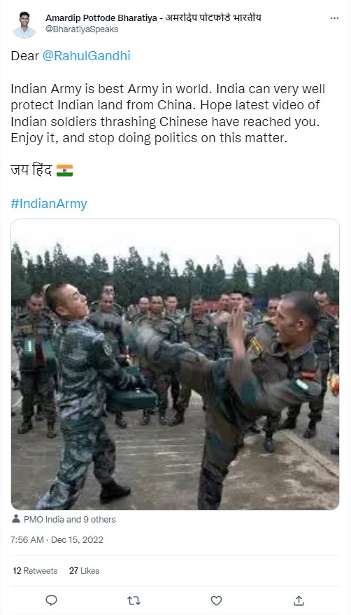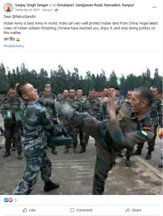 Another image showcasing an Indian army soldier seemingly kicking his Chinese counter is also going viral on social media platforms. Users who have shared the image, addressed Congress leader Rahul Gandhi and wrote, “Indian Army is best Army in world. India can very well protect Indian land from China. Hope latest video of Indian soldiers thrashing Chinese have reached you. Enjoy it, and stop doing politics on this matter. (sic)”