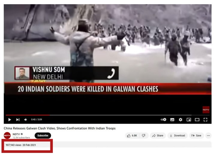 Further, a keyword search for “China,” “Galwan clash,” & “video release” on Google yielded a video uploaded on the official YouTube channel of NDTV on February 20, 2021. The description of the video read, “Hundreds of Indian and Chinese soldiers are seen in eastern Ladakh’s Galwan Valley in a new video of last year’s border faceoff tweeted by Chinese state media. The video showing the confrontation between Indian and Chinese soldiers in June last year comes after China officially acknowledged it also suffered casualties in the violent faceoff, and named four officers and soldiers who died in the border clash. India believes over 30 Chinese soldiers were killed in Galwan. Twenty Indian soldiers laid down their lives for the country in the clash.”