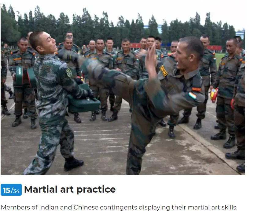 The article carried several images from the India-China combined military exercise. It featured the viral photograph with the caption, “Members of Indian and Chinese contingents displaying their martial art skills.