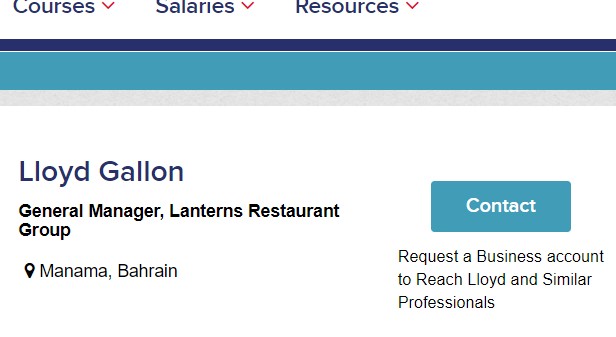 Continuing the investigation, we looked up keywords ‘Llyod lanterns restaurant Bahrain’ on Google and found link to Llyod Gallon’s profile on a website called ‘Gulf Talent.’