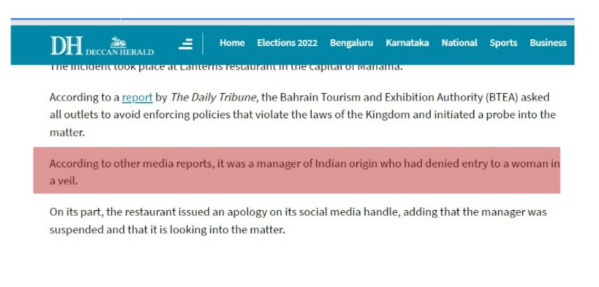 Independent also claimed, “An Indian duty manager in the restaurant Lantern in Bahrain’s Adliya area allegedly denied entry to a woman in veil, leading to the establishment posting an apology on social media.”