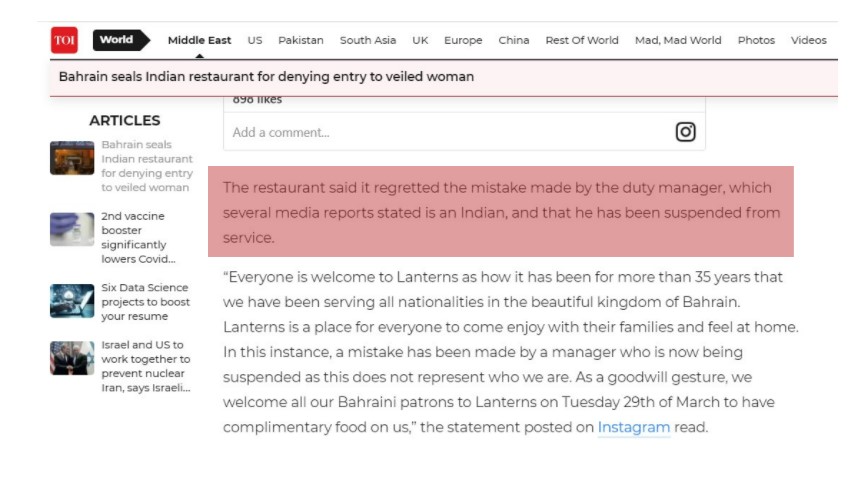 Last week, an Indian restaurant, Lanterns, in Bahrain’s Adliya landed in controversy after it was closed down by the authorities over a veiled woman allegedly being denied entry at the restaurant. Addressing the issue, the restaurant said in an Instagram post, “mistake has been made by a manager who has been suspended and this doesn’t represent who we are.” Soon after, several social media users shared posts claiming that the suspended manager was of Indian origin. Newschecker found the claim to be false.
