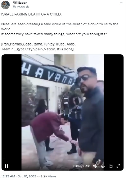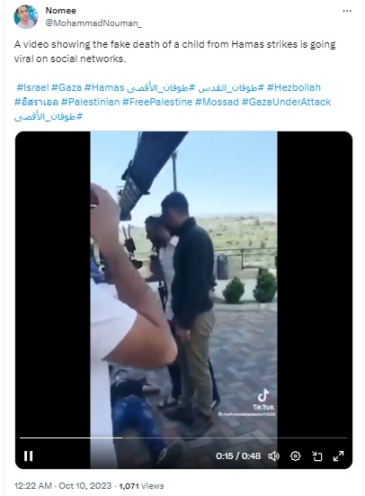 Several social media users are sharing a video, claiming that Israel is making a fake video of a child killed by Hamas, in an attempt to manipulate the media amid its conflict with the Palestinian militant organisation that has entered into a fourth day.