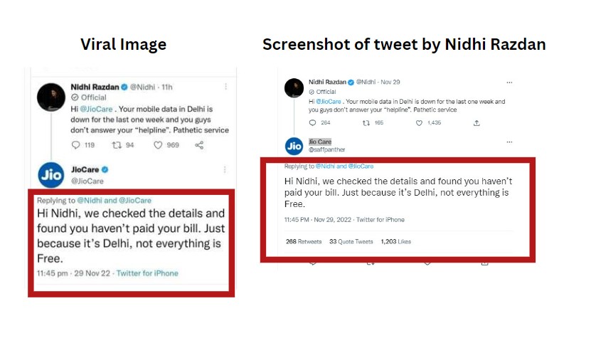 We looked up the official Twitter account of Razdan (@Nidhi) and found a tweet dated November 29, 2022 where she flagged poor mobile data services by Jio. Razdan tweeted, “Hi @JioCare. Your mobile data in Delhi is down for the last one week and you guys don’t answer your “helpline”. Pathetic service (sic).”