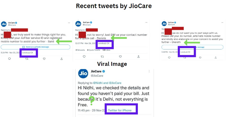 On analysing the viral image, we concluded that though Razdan’s post was authentic, the tweet showing alleged reply by Jio had some discrepancies. Firstly, @JioCare mostly posts its tweets through Locobuzz CX, however the viral image says “Twitter for iPhone.” Additionally, Jio’s replies always end with the name – most likely of their employee who is handling that specific complaint. Thirdly, the first letter of the word ‘Free’ is in uppercase in the middle of the sentence.