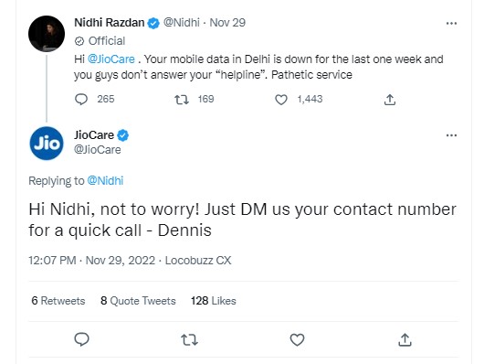 However, we did come across a tweet by @JioCare asking Razdan to share her contact details “for a quick call.” The tweet read, “Hi Nidhi, not to worry! Just DM us your contact number for a quick call – Dennis.”