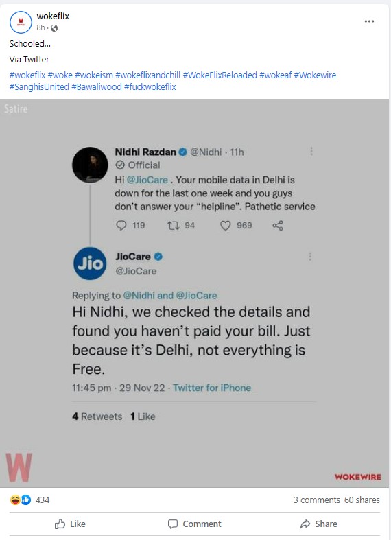 Notably, we did find a tweet by account ‘@saffpanther’, whose displayname says ‘Jio Care’, stating, “Hi Nidhi, we checked the details and found you haven’t paid your bill. Just because it’s Delhi, not everything is Free.”