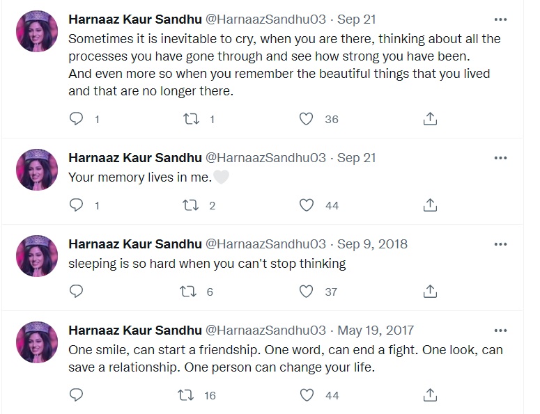Newschecker searched Twitter for user @Harnaazsandhu03 and checked its interactions with other users on the social media platform. Newschecker found that the account did not have any tweets relating to Harnaaz before November 1, 2021. The tweets from 2017 to September 2021 are generic in terms of content and few in number.
