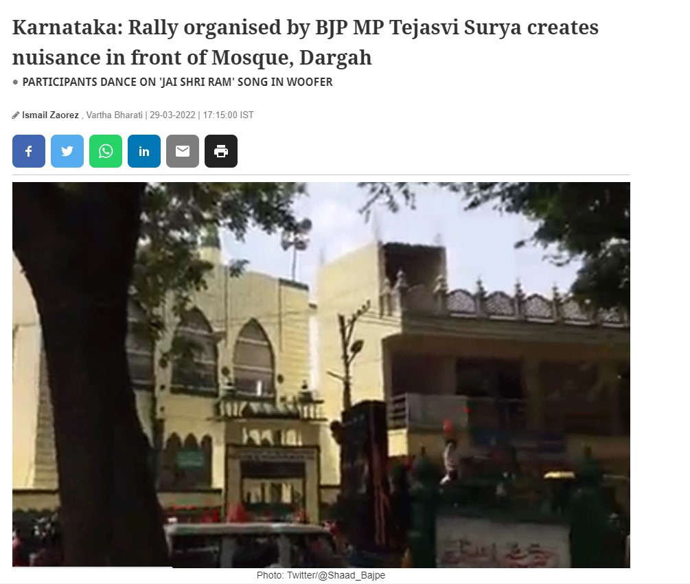 According to the report, “BJP MP Tejasvi Surya who had organised a cycle rally from Bengaluru to Kolar on March 27 is once again in the headlines after a video has surfaced on social media wherein the participants of the rally can be seen creating nuisance in front of a mosque and a dargah on their way to Kolar.”