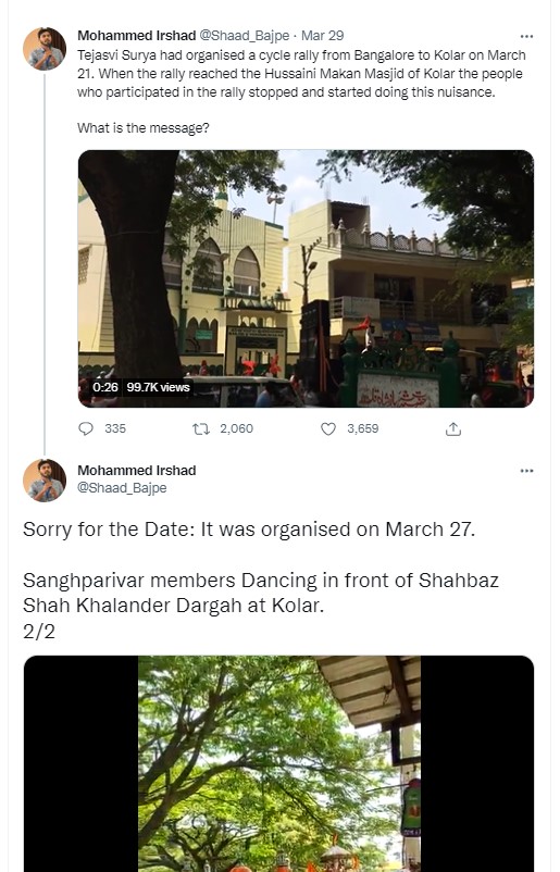 We scrolled through the Twitter feed of user ‘@Shaad_Bajpe’, who is identified as a journalist, and found that the viral video was tweeted by him on March 29 with the caption, “Tejasvi Surya had organised a cycle rally from Bangalore to Kolar on March 21. When the rally reached the Hussaini Makan Masjid of Kolar the people who participated in the rally stopped and started doing this nuisance.” He has corrected the date of the rally to March 27 instead of March 21 in the next tweet.