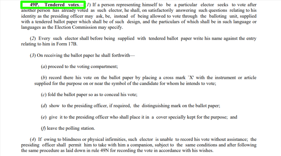 Section 49P of the Conduct of Election Rules, 1961 deals with the ‘tendered vote.’ It states, “ If a person representing himself to be a particular elector seeks to vote after another person has already voted as such elector, he shall, on satisfactorily answering such questions relating to his identity as the presiding officer may ask, be, instead of being allowed to vote through the balloting unit, supplied with a tendered ballot paper which shall be of such design, and the particulars of which shall be in such language or languages as the Election Commission may specify.”