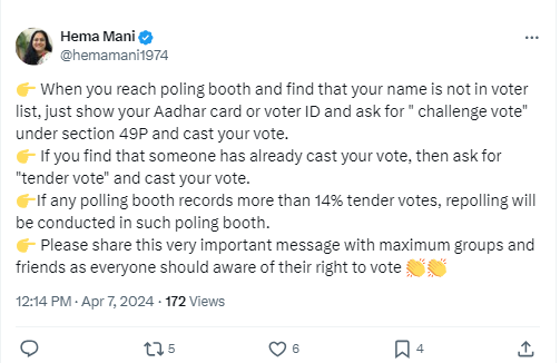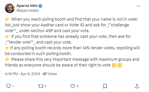 As the country gears for the Lok Sabha polls, a viral WhatsApp forward claiming to spread awareness about “voter’s rights,” by detailing “challenge vote,” and “tender vote” is being widely shared on social media platforms.