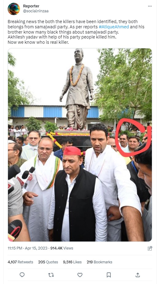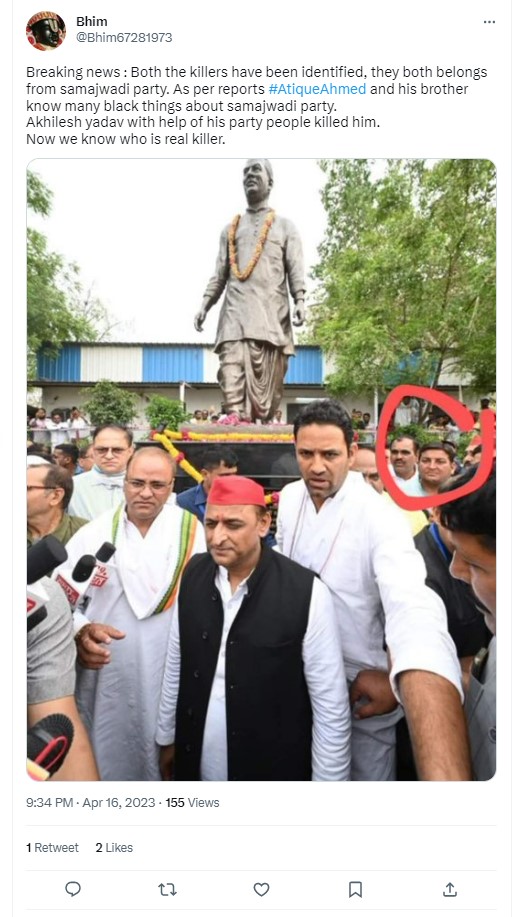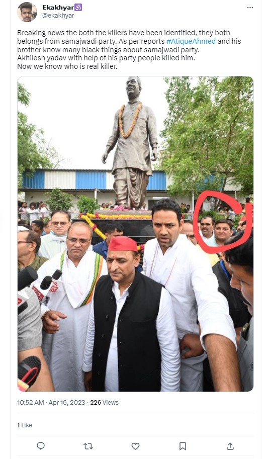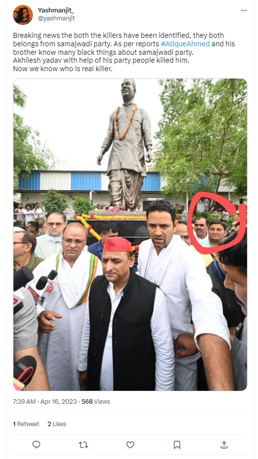 The image is being widely shared as evidence to show Yadav and the Samajwadi party’s role in Atiq Ahmed’s killing. They further claimed that Ahmed and his brother knew “many black things about Samajwadi Party. Akhilesh Yadav with the help of his party people killed him. Now we know who is the real killer. (sic)”