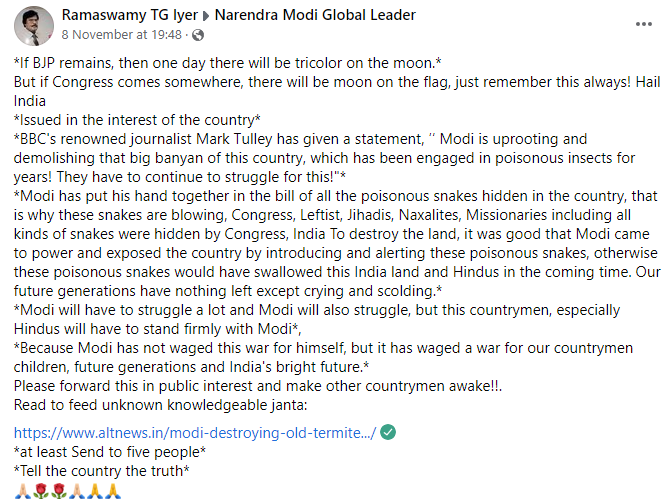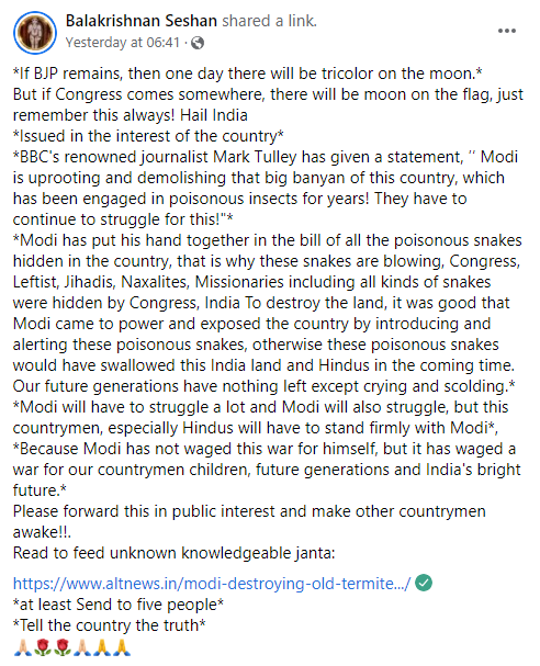 Comparing the Congress to a big banyan which “Modi is uprooting and demolishing”, it goes on to call Congress, Leftist, Jihadis, Naxalites, Missionaries “snakes” that were destroying the country, and hails PM Modi for “exposing” them. The message further goes on to urge that “Hindus will have to stand firmly with Modi” as he is “waging a war for our countrymen.”