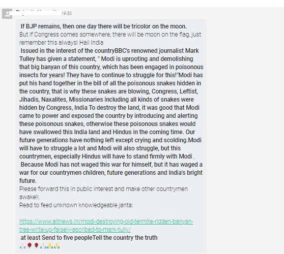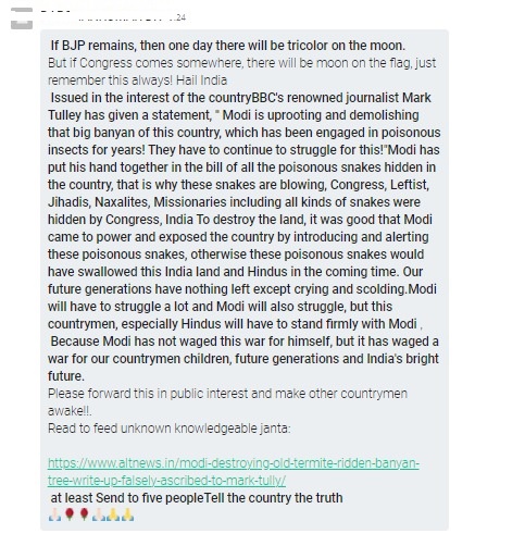 A message criticizing the Congress party attributed to renowned journalist and author Mark Tully is doing the rounds on various social media platforms. Newschecker’s investigation found the message to be falsely attributed to the former New Delhi bureau chief of the BBC and is fabricated.