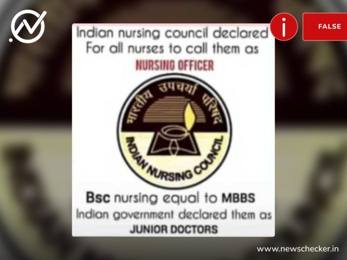 A circular allegedly issued by the Indian Nursing Council stating that the nurses are to be henceforth known as nursing officers, and that BSC nursing is equivalent to MBBS, putting them in the same category as junior doctors, has gone viral. Newschecker found the claim to be false. In a tweet, dated June 8, 2023, the Ministry of Health clarified that the alleged “Indian Nursing Council” circular, announcing that nurses will be known as nursing officers and that BSC nursing will be considered equivalent to MBBS, is fake. Read more here.