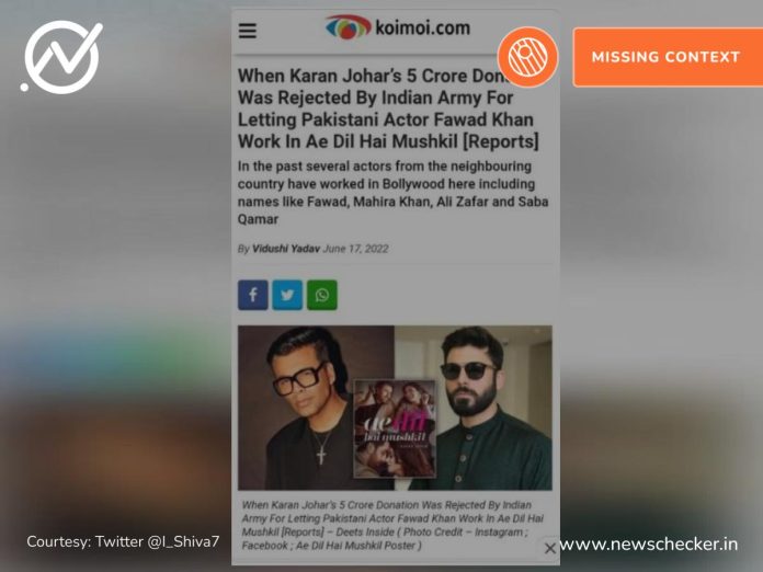 A screenshot of an alleged report by Koimoi.com titled “When Karan Johar’s 5 Crore Donation Was Rejected By Indian Army For Letting Pakistani Actor Fawad Khan Work In Ae Dil Hai Mushkil [Reports],” is going viral on social media platforms. Several Twitter users shared the screenshot claiming it to be a “tight slap” on Brahmastra’s producer Karan Johar’s face. Newschecker found that though the website did publish the article, the headline is misleading and does not tell the entire story. Read more here.
