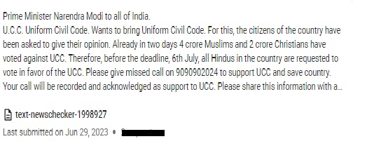 Several social media users are circulating what appears to be a campaign for the implementation of the Uniform Civil Code (UCC), urging Hindus to give a missed call to 9090902024, so as to indicate their consent for UCC. “Already in two days 4 crore Muslims and 2 crore Christians have voted against UCC. Therefore, before the deadline, 6th July, all Hindus in the country are requested to vote in favour of the UCC. Please give missed call on 9090902024 to support UCC and save the country (sic),” read a Whatsapp forward.