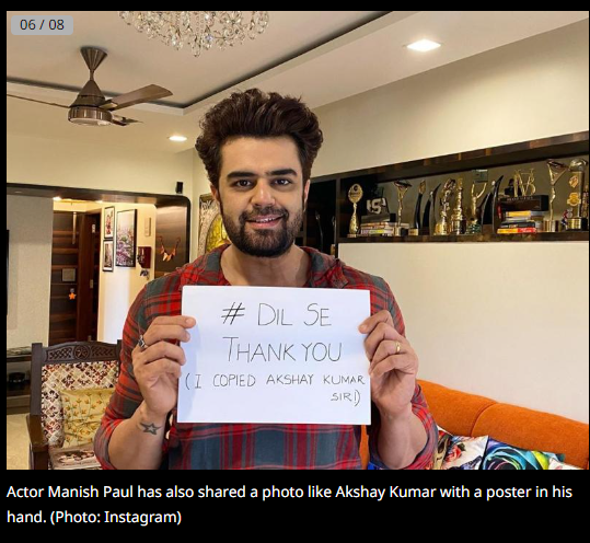 Actors Akshay Kumar and Manish Paul had posted on their social media handles thanking all the corona warriors including doctors, policemen, nurses along with others for their efforts during the first Covid-19 lockdown.