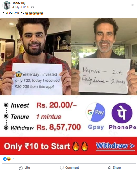 An image is being shared on social media in which actors Chiranjeevi, Akshay Kumar and Manish Paul are seen holding a placard promoting an online trading app. The placard reads “Deposit 20Rs – Daily income 2000Rs”. Newschecker found these images were morphed with the placard replaced with a different text.