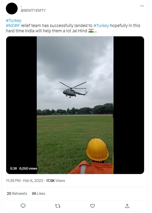 Notably the viral video can be traced back to at least July 2021. The earthquake hit Turkey and Syria on February 6, 2023, following which India launched “Operation Dost” to assist the rescue and relief efforts in the affected countries. We could conclude that the clip predates the occurrence of the earthquake, and hence does not show India’s NDRF personnel landing in Turkey for rescue efforts.