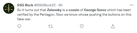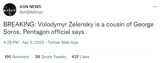Among the many social media users who shared the claim is the handle @MUBreaking, whose tweet received over 2,000 retweets and 6,000 likes. The caption of the tweet, posted on April 6, 2022, reads “BIG: Zelensky is a cousin of George Soros. Pentagon official says.”