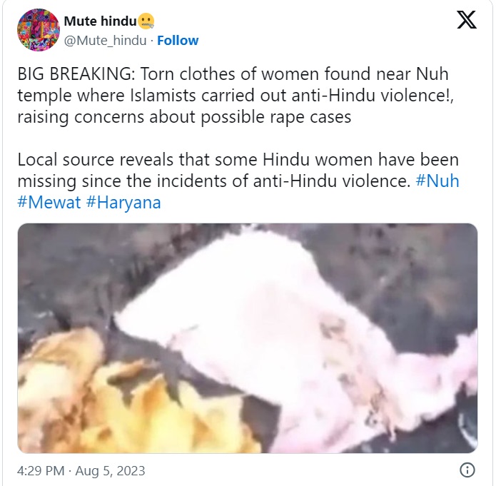 Another person who identifies himself as Radheyshyam, who also claims to be a resident of Nuh, says “You can see clothes of women lying here in front of you. Where do you think women went abandoning their clothes? Something untoward has happened with them. It is evident that the clothes have been torn. Something really wrong has happened here. Look, even clothes belonging to children can be seen here.”
