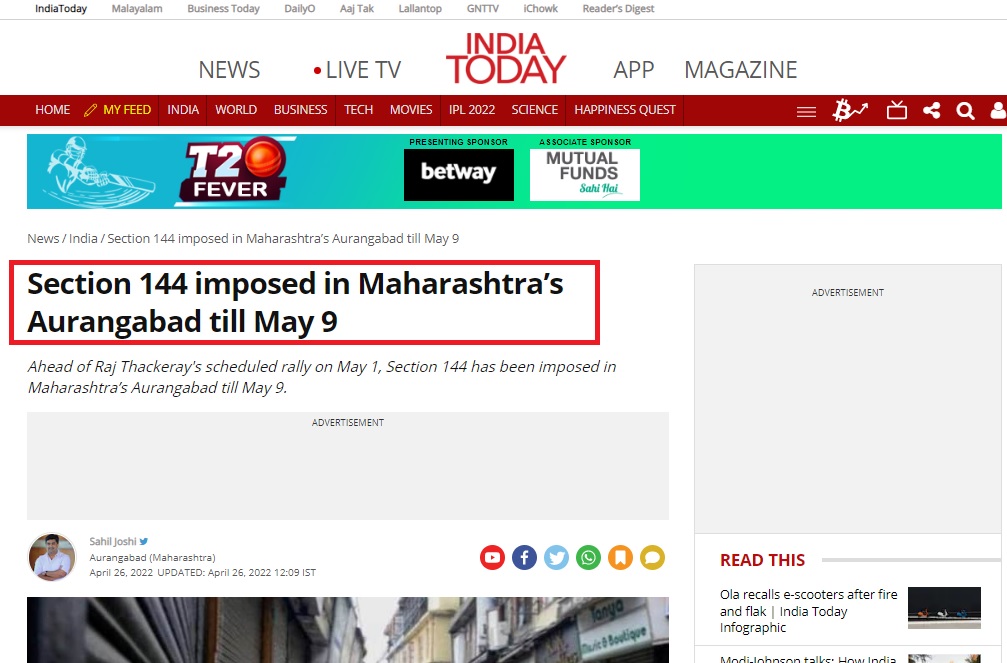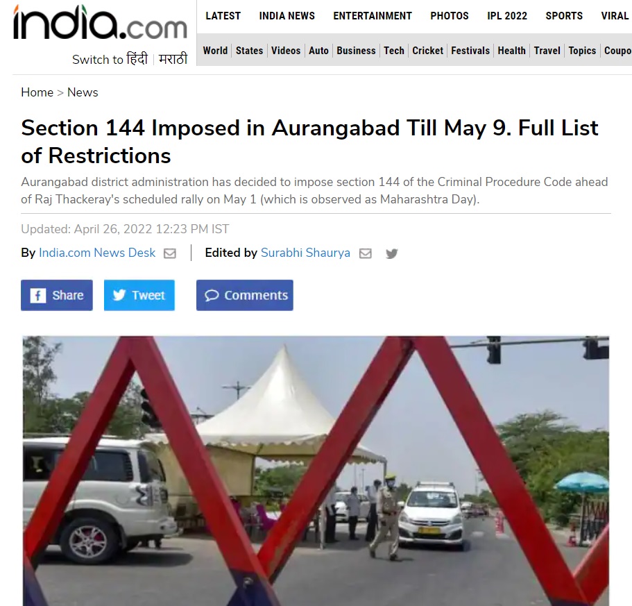 Ahead of MNS President Raj Thackeray’s scheduled visit to Aurangabad on May 1, several media outlets, both national and Marathi, reported that section 144 has been imposed in the city.