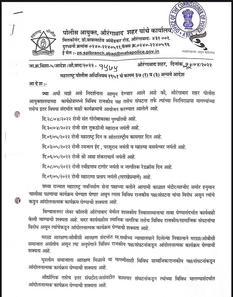 On research, Newschecker found an order issued by the Commissioner of Police, Aurangabad on 22 April 2022 under Sections 37 (1) and (3) of the Maharashtra Police Act, 1951.