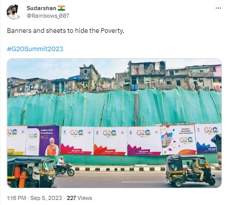 Several social media users are circulating a photo, claiming that slums are being covered with sheets and banners ahead of the G20 Summit to be held between September 9-10, 2023, in New Delhi. “Had [Prime Minister] Modi focused on the welfare of ordinary Indians instead of exclusively catering to his rich friends for nine years, he might not have to use curtains and posters to hide poverty now,” read one such post, featuring the photo.