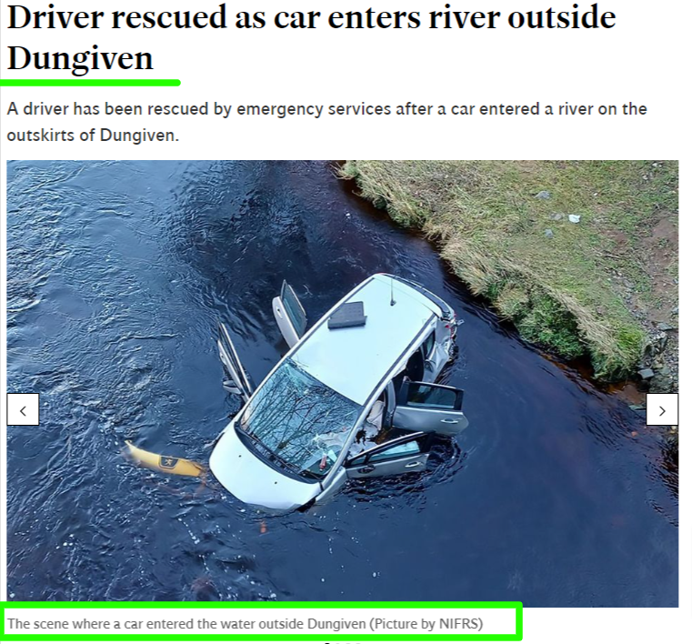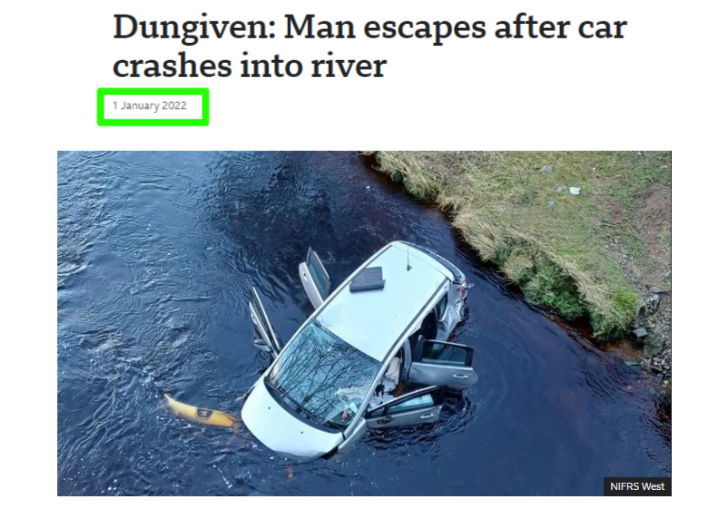 Following this, we looked up keywords “NIFRS West,” “Dungiven,” “River,” and “car” on Google which yielded a report by Belfast Telegraph, dated January 1, 2022. It featured the viral image with the caption, “The scene where a car entered the water outside Dungiven (Picture by NIFRS)”