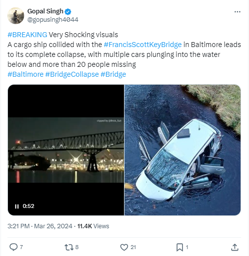 Multiple X users shared the photograph of a submerged car, along with the visuals of the Baltimore bridge collapse.